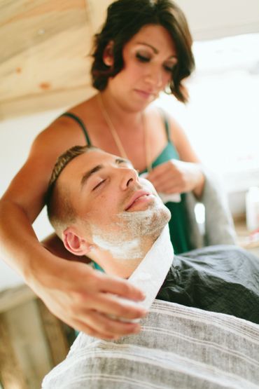 The men deserve some pampering too. Have the Groom and his groomsmen step into the Airstream for a hot straight shave and a hair cut. Our lady barbers will clean around the edges, wash (from May-Sept), cut, and style their hair after a nice, hot shave. *Straight Shave Services are only provided in the Hairstream. For on-site Men's Grooming, we provide simple hair clean ups, beard trims and neck trims with clippers and trimmers (NO STRAIGHT RAZOR).